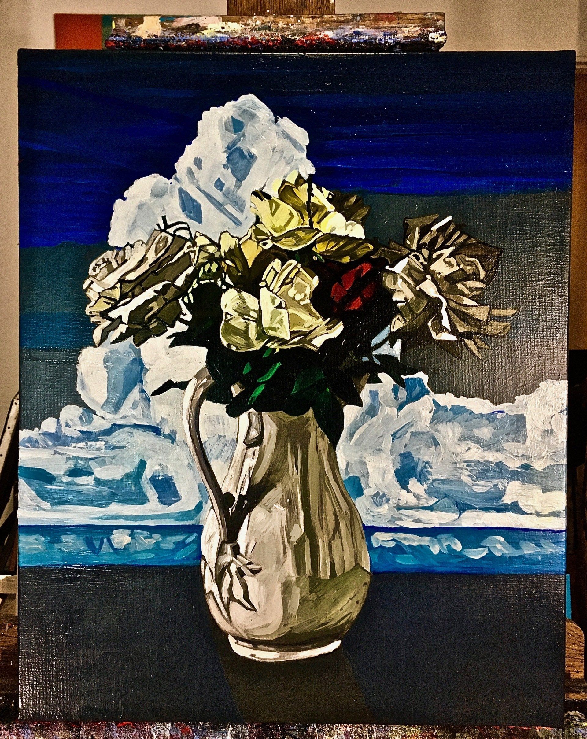 A new painting. Oil on linen. This photo is darker than the original is. One of the sumptuous results of the Big Bang. Pink roses near the Grand Palais, Paris. Near a temple of art, the masterpiece of nature.