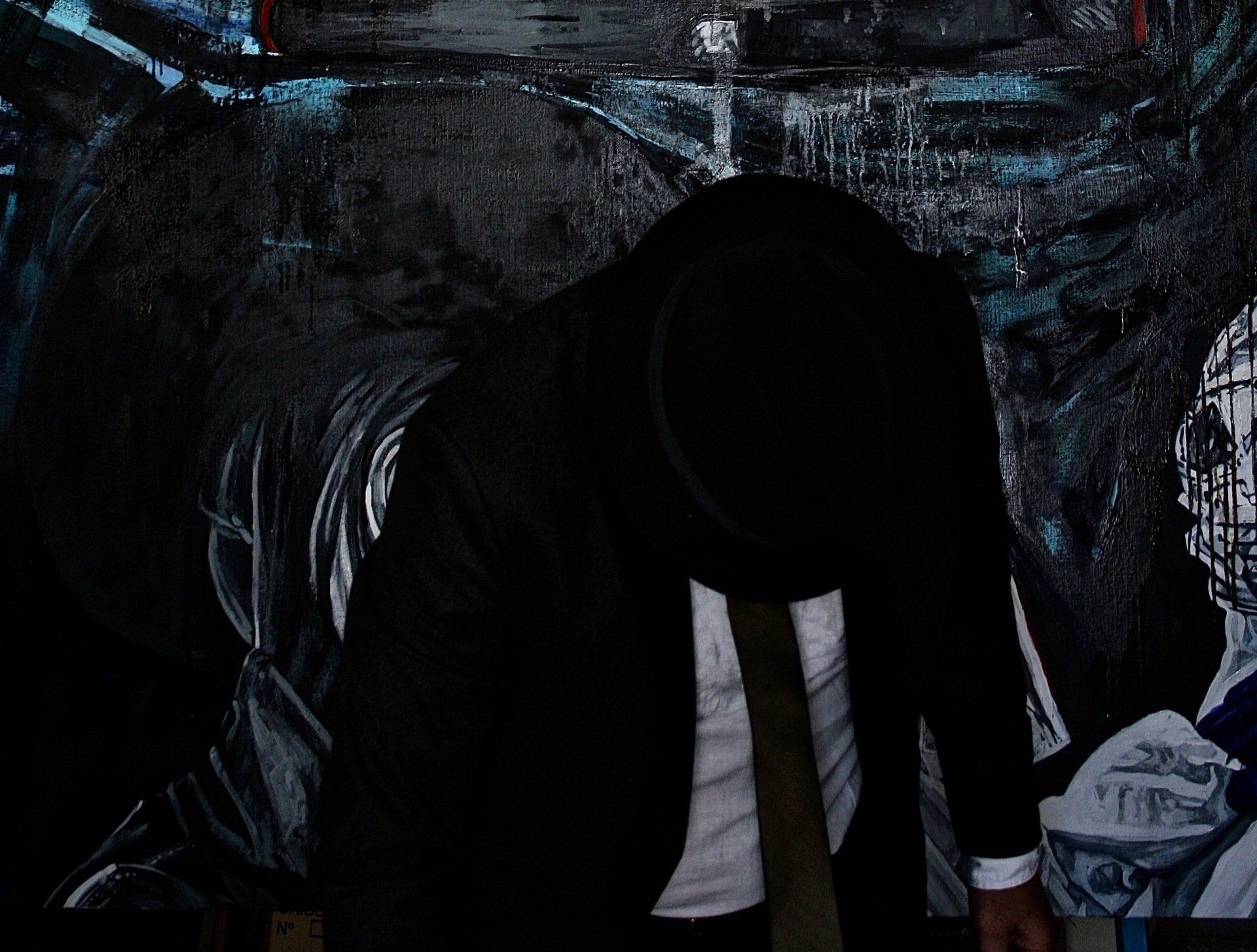 Depuis 1996, l’artiste peint le son. Mélodies, rythmes, syncopes, vibrations traduites sur toile, hypnotisent. Joué de préférence la nuit, le Jazz a, comme l’ombre, d’infinies nuances. La lumière du jour blesse l’œil, les pinceaux de lumière artificielle colorent la scène, jouissive. Aux pulsations des cuivres entre les doigts de joueurs véloces, la gestuelle de l’artiste possédé fait écho. Les couleurs sonnent. Les nappes de sons, par vagues, inondent le public. Synergie. Dans les plis de l’obscurité, des désirs et pulsions...”
