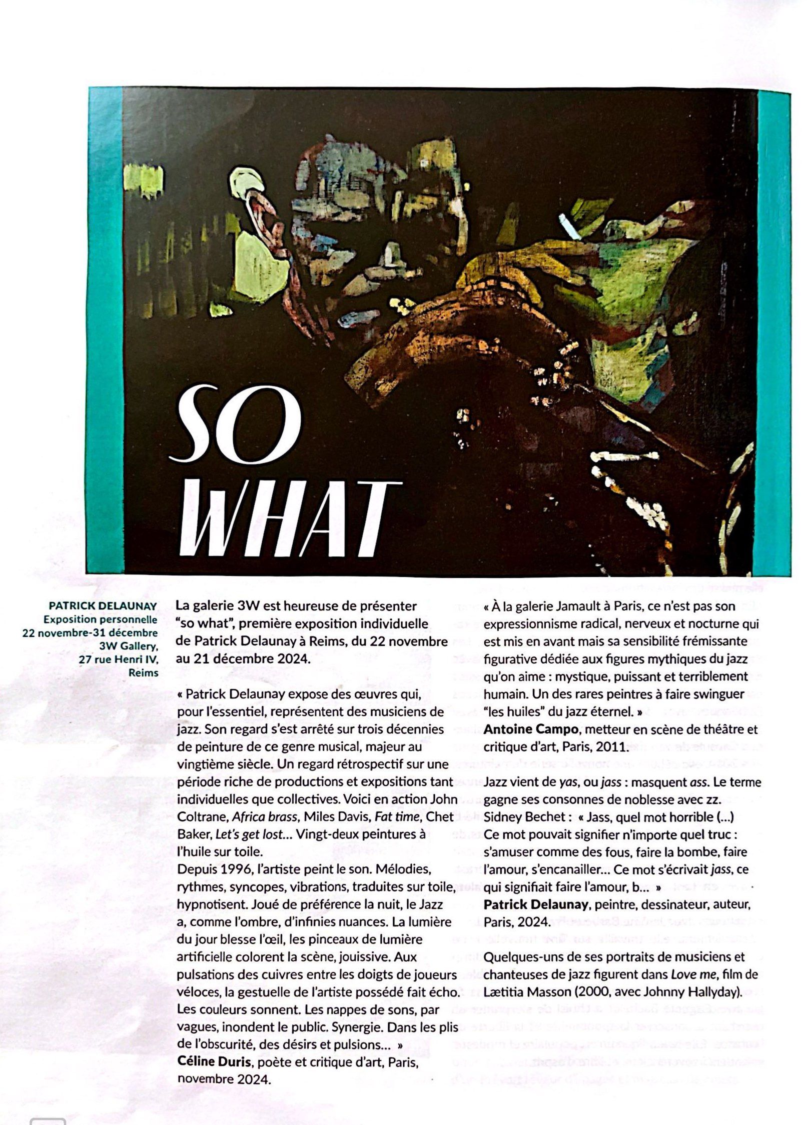 « À la galerie Jamault à Paris, ce n'est pas son expressionnisme radical, nerveux et nocturne qui est mis en avant mais sa sensibilité frémissante figurative dédiée aux figures mythiques du jazz qu'on aime : mystique, puissant et terriblement humain. Un des rares peintres à faire swinguer “les huiles” du jazz éternel. »